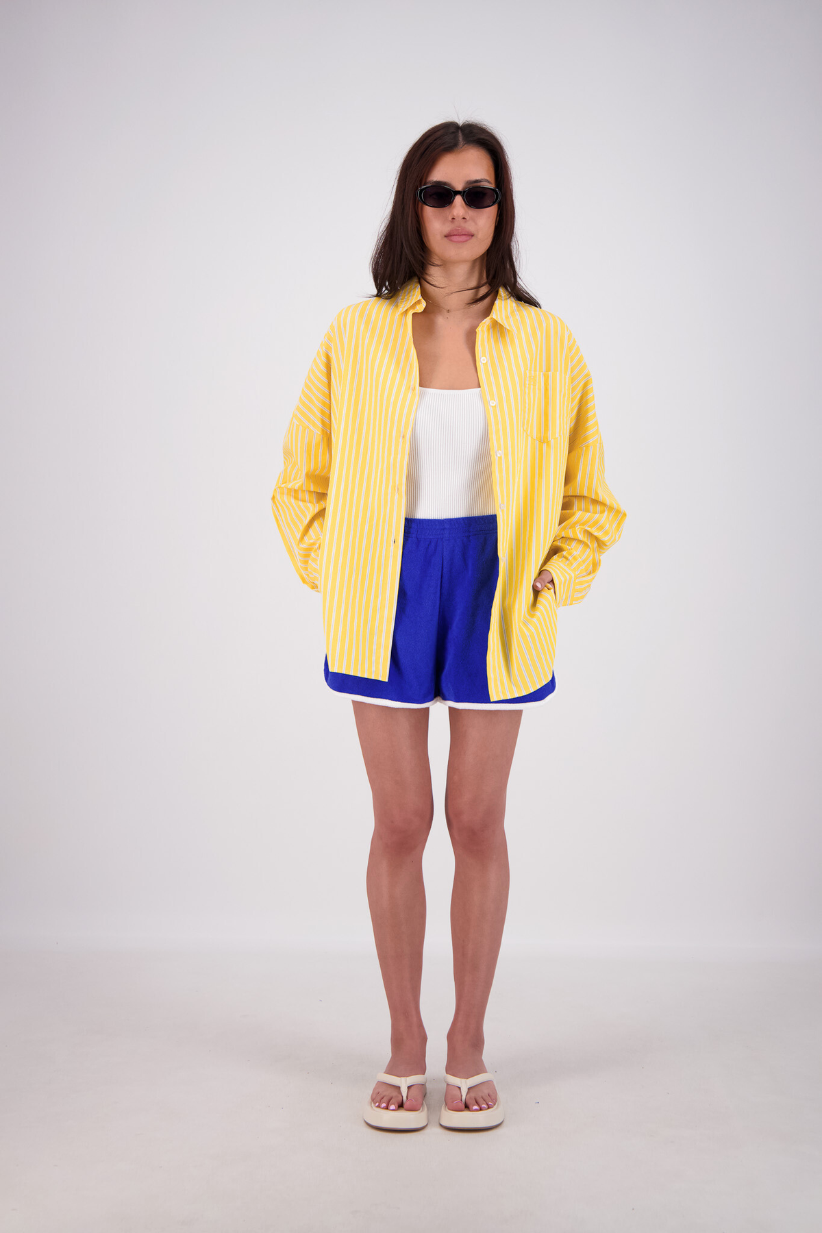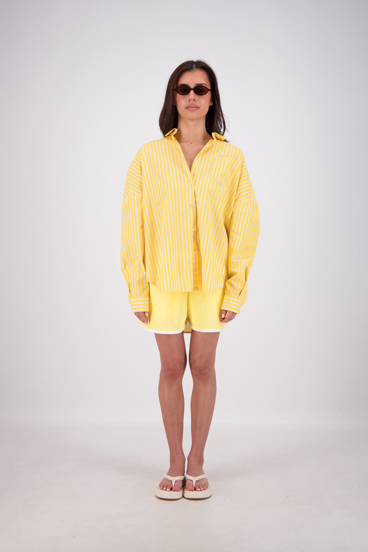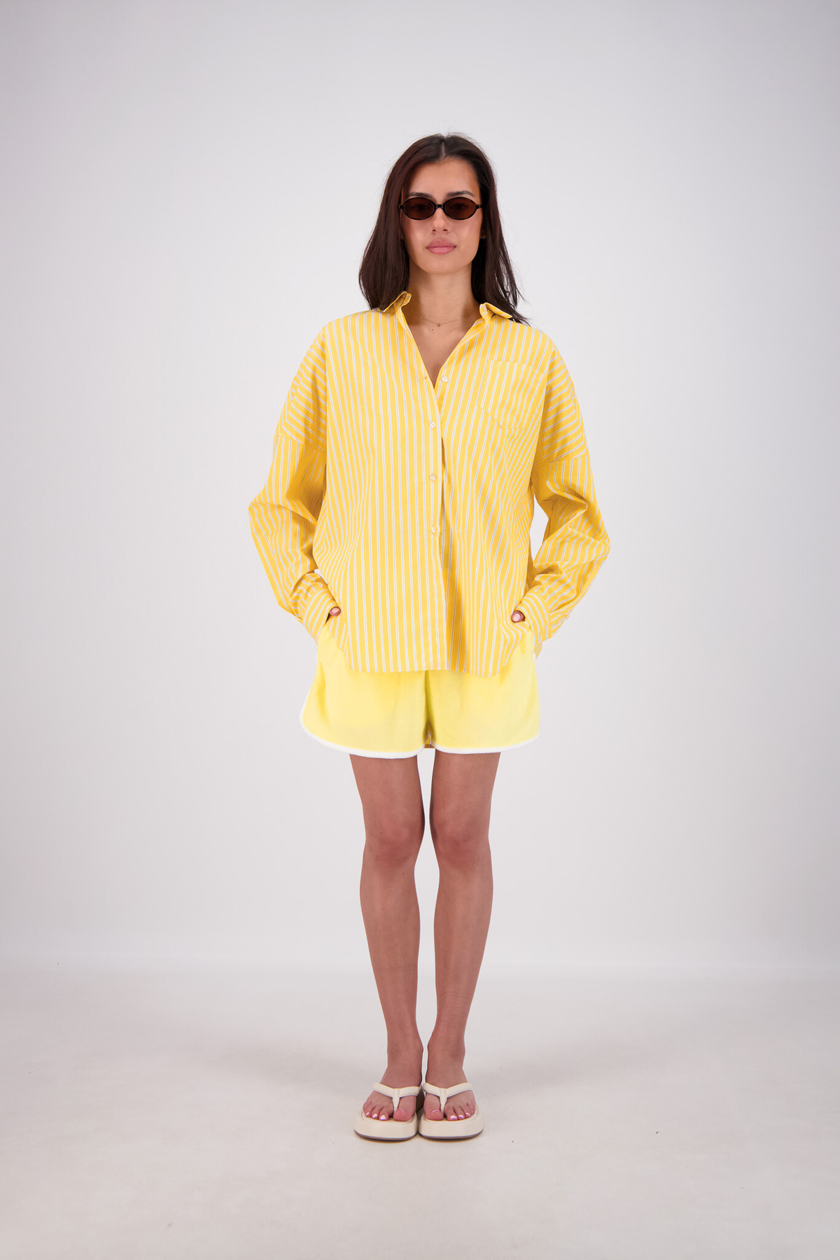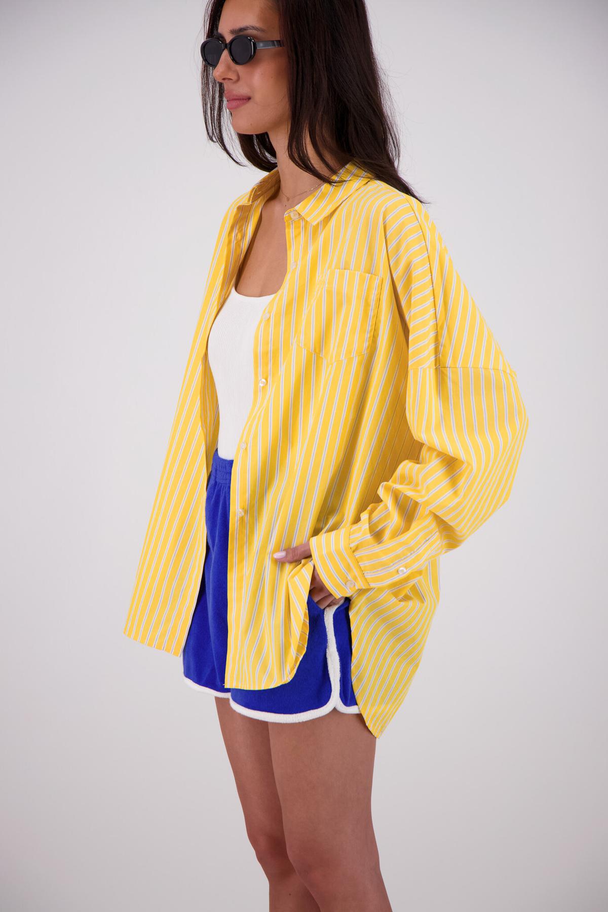 The Mahalo Shirt features an oversized relaxed fit with an embroidered patch pocket, front button-down placket, button-up cuffs, and curved scoop hem for casual yet polished style.